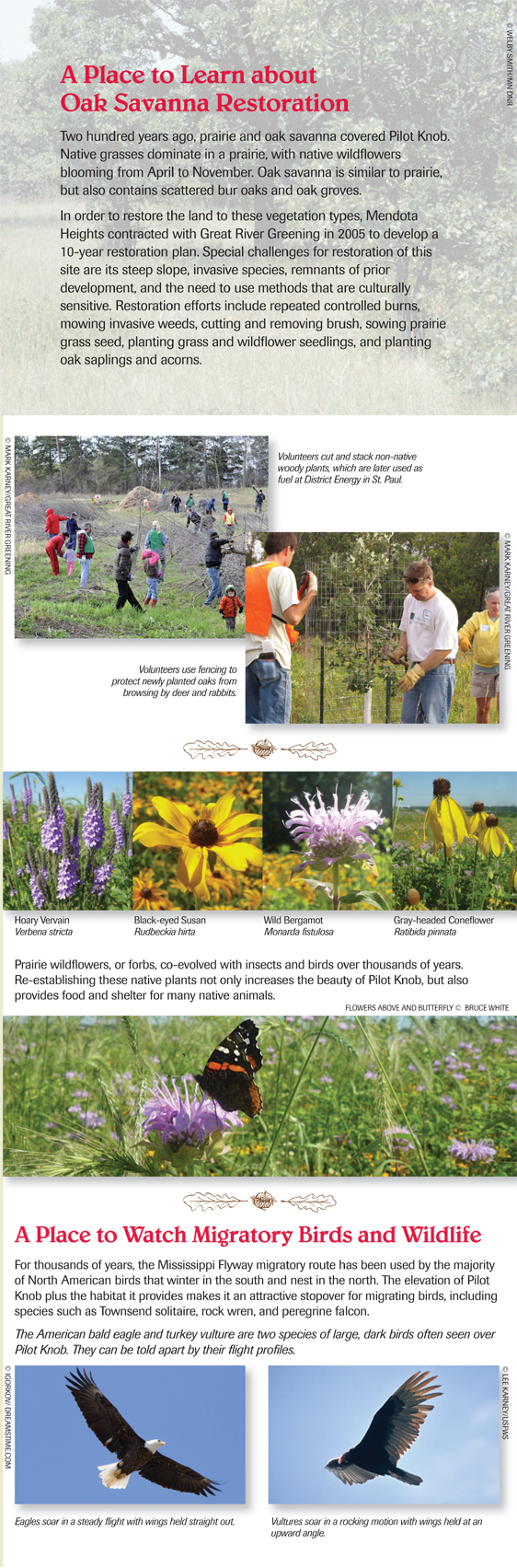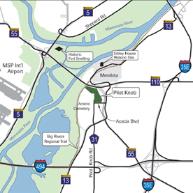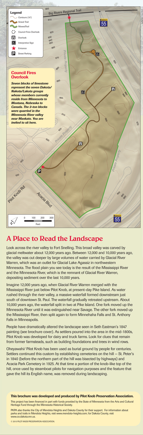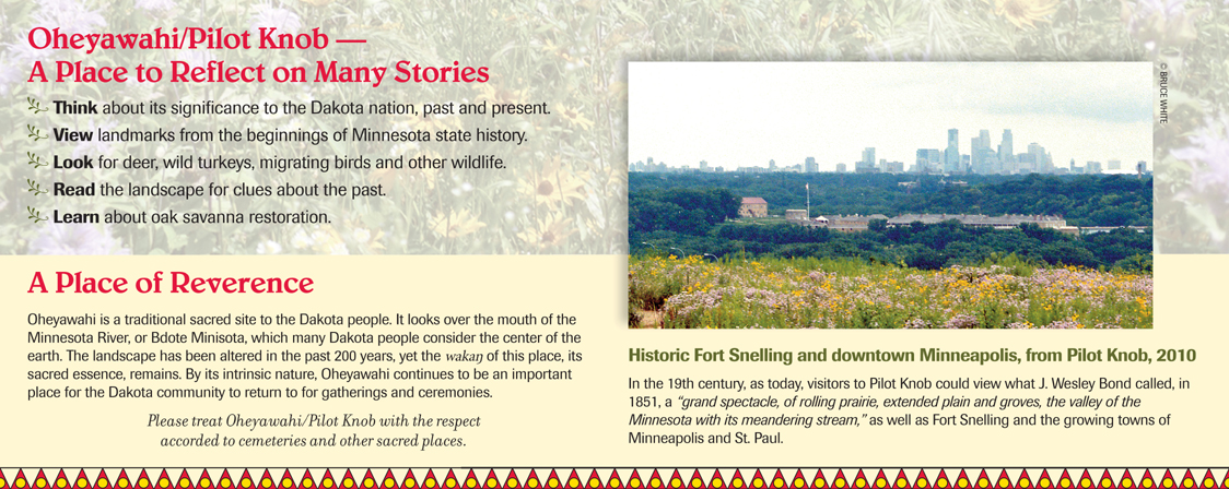is a place of cultural importance to the Dakota community and of significance in the history of Minnesota statehood. Oheyawahi/Pilot Knob is protected by the City of Mendota Heights as an Open Space site. Oheyawahi/Pilot Knob is located at 2100 Pilot Knob Road, Mendota Heights. From I-494, take the Pilot Knob Road exit, then drive north until the road ends. From State Highway 13, take the Acacia Blvd. exit west to Pilot Knob Road. Turn right. Park along the street. Oheyawahi/Pilot Knob can be visited every day during daylight hours. There are interpretive signs and trails; there are no other facilities.