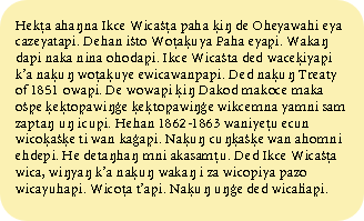 A Place to Appreciate Dakota Heritage This is the north slope of Oheyaw ahi, “a hill much visited,” also now known as Wotakuye Paha, “the hill of all the relatives,” a sacred place nam ed by Dakota people centuries ago. This hill has been a gathering place for Dakota, Ojibwe, and Iowa people, and a place for ceremonies and burials. Pilot Knob was the site of signing of the Treaty of 1851, w hich transferred 35 million acres of Dakota land to the United States. In the winter of 1862-63, 1300 Dakota men, women, and children w ere confined in a fenced camp on the opposite river bank, w here many died. Some w ere buried here. Text from Pilot Knob historical markers; Dakota version courtesy of Glenn Wasicuna. |